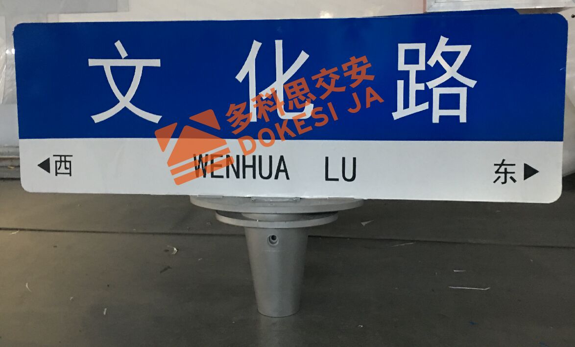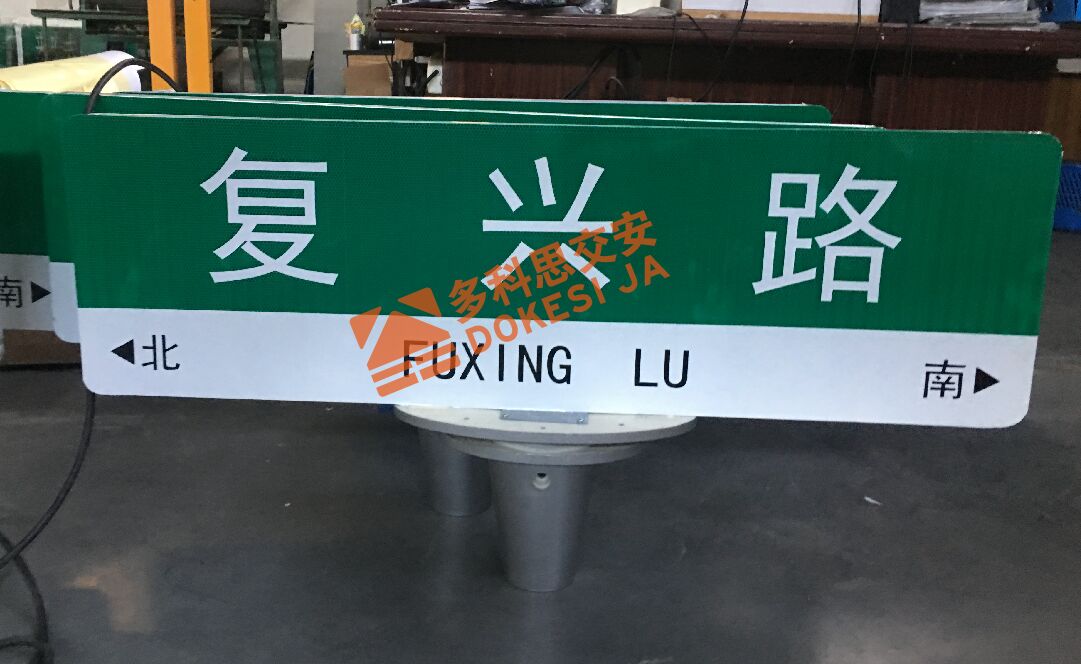 4、顏色:東西方向,上方為藍(lán)底白字;南北方向,上方為綠底白字;下方均為白底黑字。反光膜為二級(jí)高強(qiáng)反光膜。