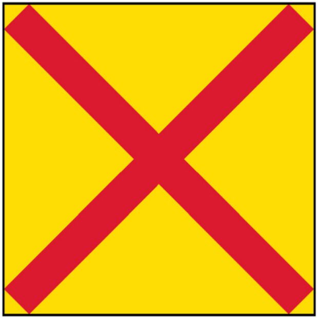 根據國標《中國海區(qū)可航行水域橋梁助航標志》(GB 24418)的技術要求,橋孔禁航標志的整體形狀為方型,版面為黃色底膜,紅色叉形圖案,若采用LED發(fā)光標志工藝,要求其燈色為紅色定光,夜間“紅×”圖案顯示為紅色燈光。設置于橋孔上方,表示該橋孔僅為對向航道通航方向,本方向為禁航方向,不得通行。版面圖標如下: