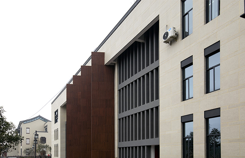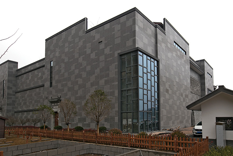 以淺米色花崗巖貼片為主體,正面清灰板巖深淺混搭,完美勾繪出千島湖明清時(shí)代深墻大院的風(fēng)韻。