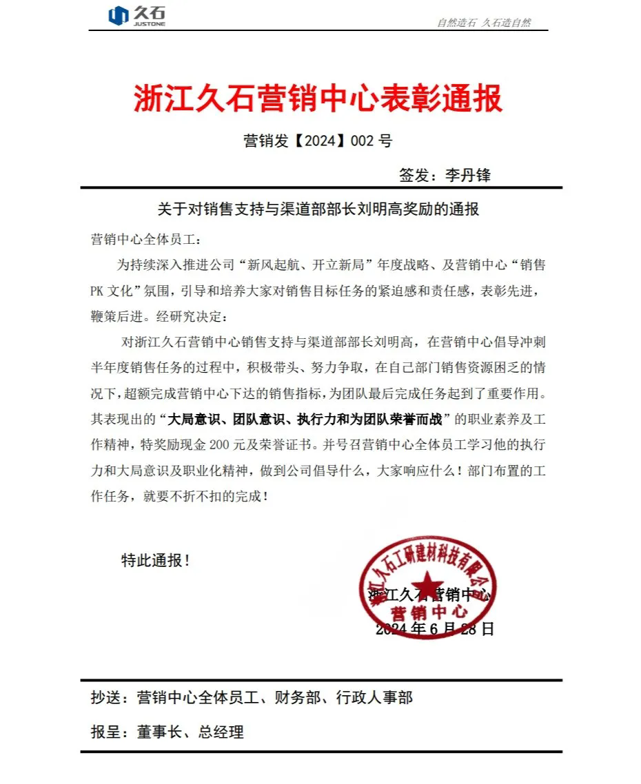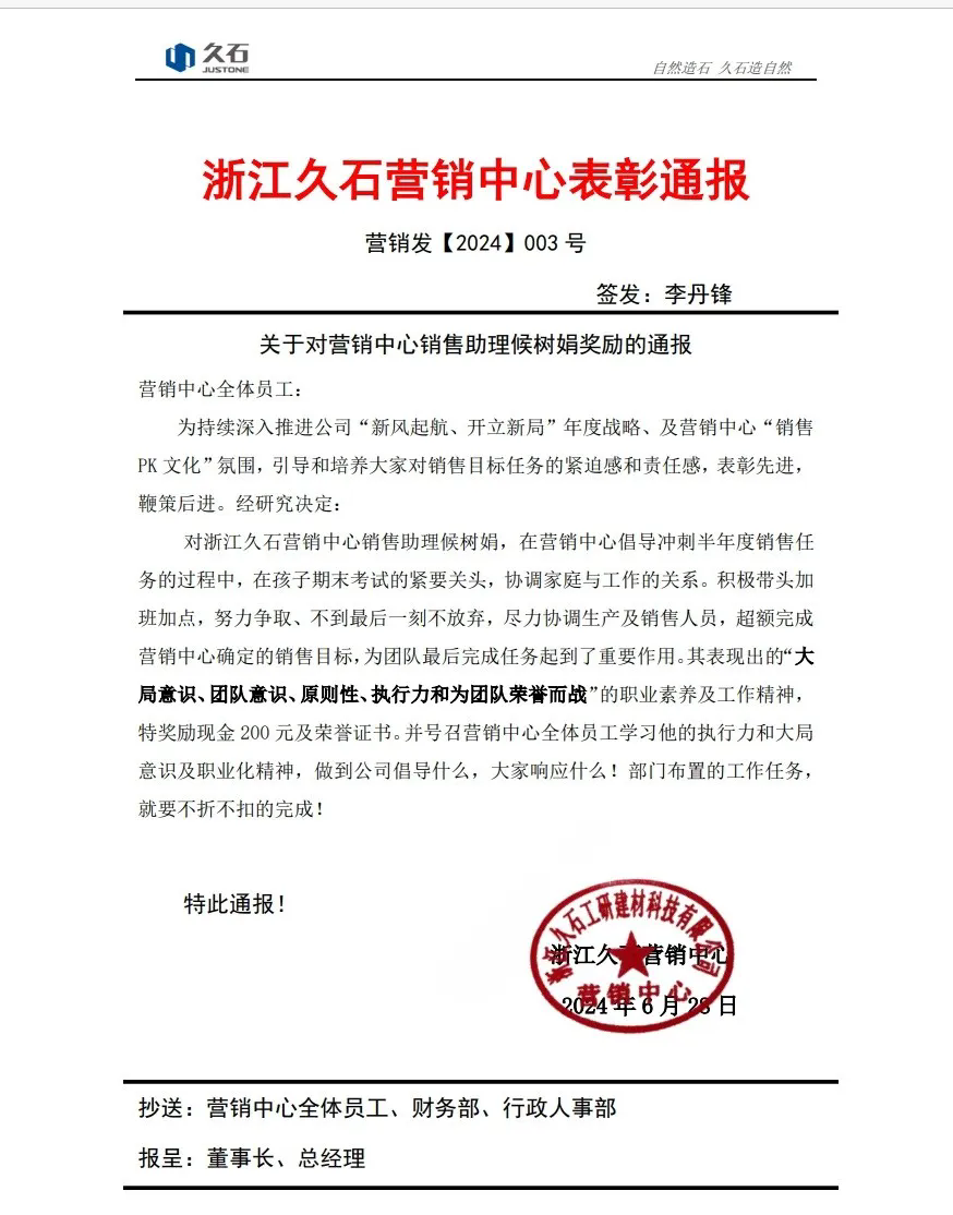2024年上半年,久石銷售業(yè)績(jī)?cè)賱?chuàng)新高,取得了上半年同期增長(zhǎng)78.4%、6月份同期增長(zhǎng)109%的好成績(jī)。在營(yíng)銷中心倡導(dǎo)沖刺半年度銷售任務(wù)的過程中,營(yíng)銷中心銷售支持與渠道部部長(zhǎng)劉明高、銷售助理侯樹娟表現(xiàn)優(yōu)異,分別榮獲200元現(xiàn)金獎(jiǎng)勵(lì)及榮譽(yù)證書。